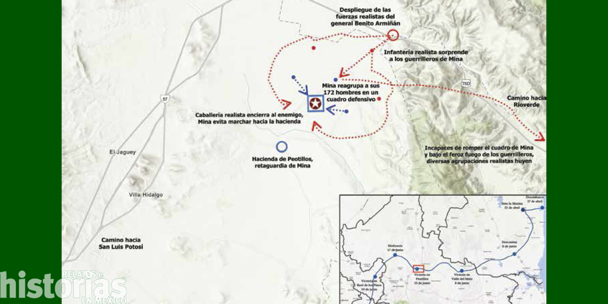 Después de la triunfante batalla en Valle del Maíz (San Luis Potosí) el 8 de junio, Mina se enteró de que el comandante Armiñán lo seguía a marchas forzadas desde Altamira, junto con un numeroso cuerpo de caballería e infantería. El general avanzó con rapidez por las planicies desérticas, carente de agua y provisiones, con sus guerrilleros sumamente fatigados y hambrientos, hasta llegar a la hacienda de Peotillos el 14 de junio por la noche.